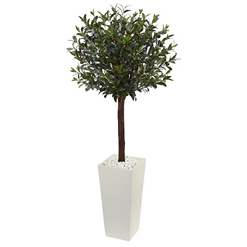 Nearly Natural 5’ Olive Topiary Artificial Tree in White Tower Planter 5, Green