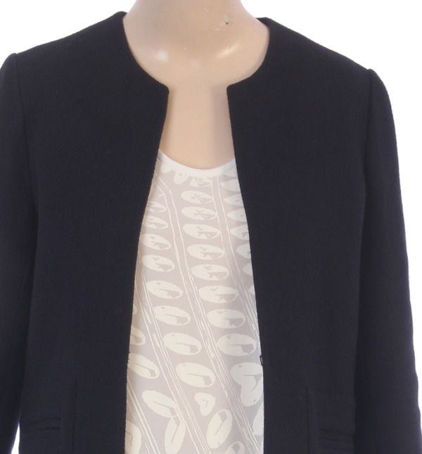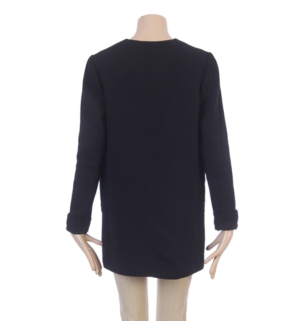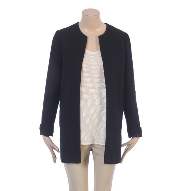 SISLEY, 깔끔한 솔리드톤에 칼라리스 라운드넥 및 립포켓으로 깔끔함을 살린 포멀한 무드의 걸고리 앞여밈 자켓입니다