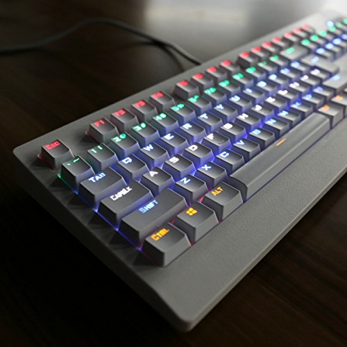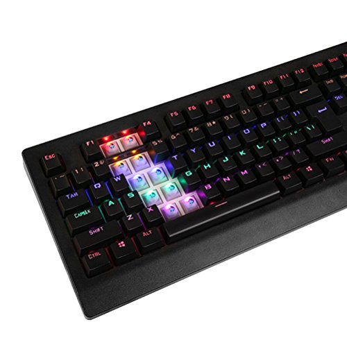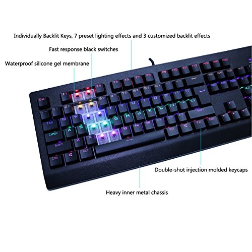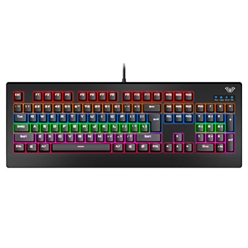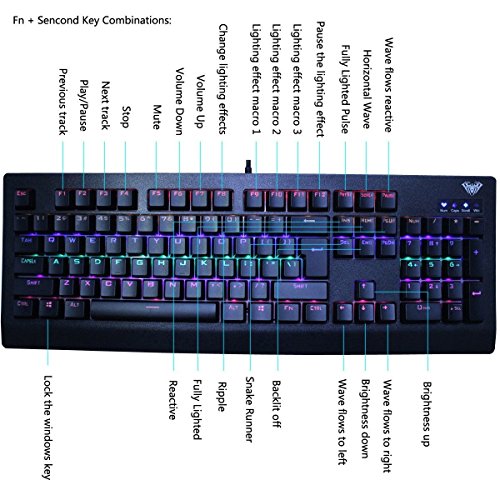 - Feature : It's all about color: multi-color backlit, preset 7 lighting effects, 3 customized macro lighting effects, make it a very amazing shining mechanical keyboard. / All new design AULA mechanical black switch, provide a fast response feedback (NOT loud clicky sound). Great for professional gamer. / Solid reliable mechanical gaming keyboard: build in metal chassis and waterproof silicone gel membrane cover on every single switch. / Double-shot injection molded keycaps and full 104 keys NKRO on USB. / System support: Windows 2000, Xp, Vista, 7, 8,10/Mac OS and USB 2.0 port.