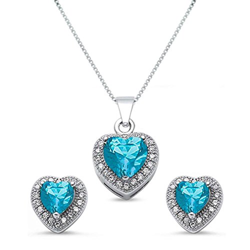 -. Title : Sterling Silver Heart Shaped Simulated Aquamarine Necklace and Earrings Set