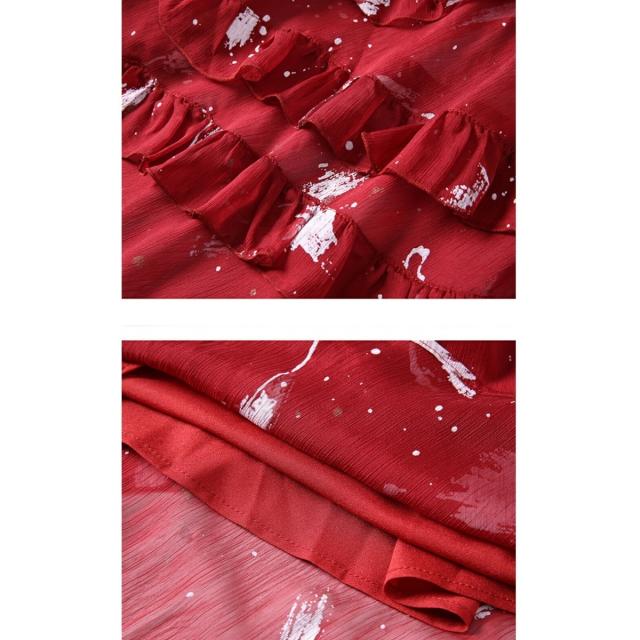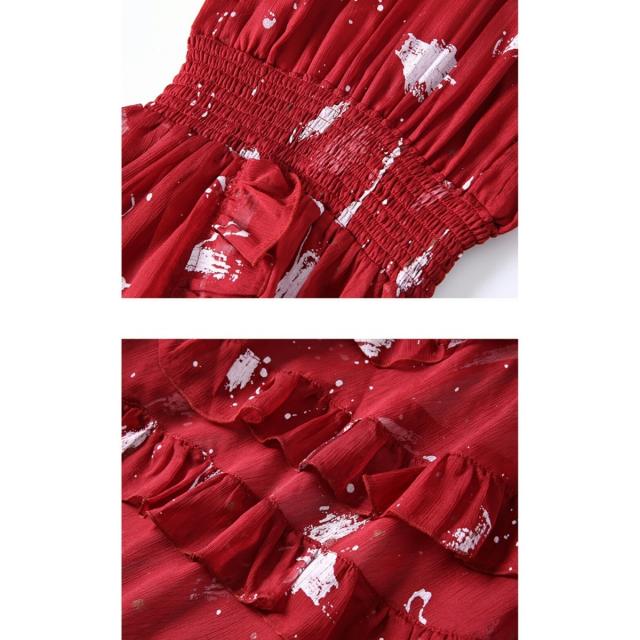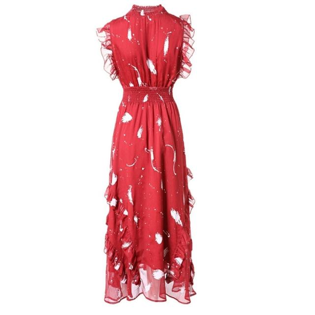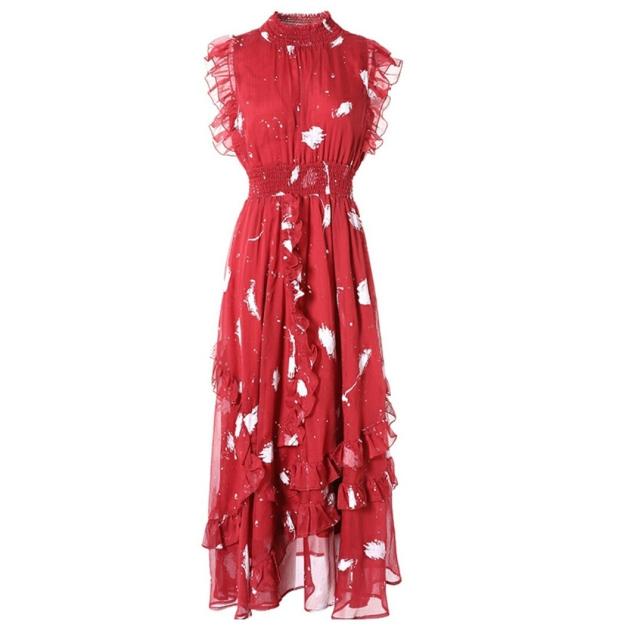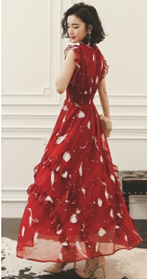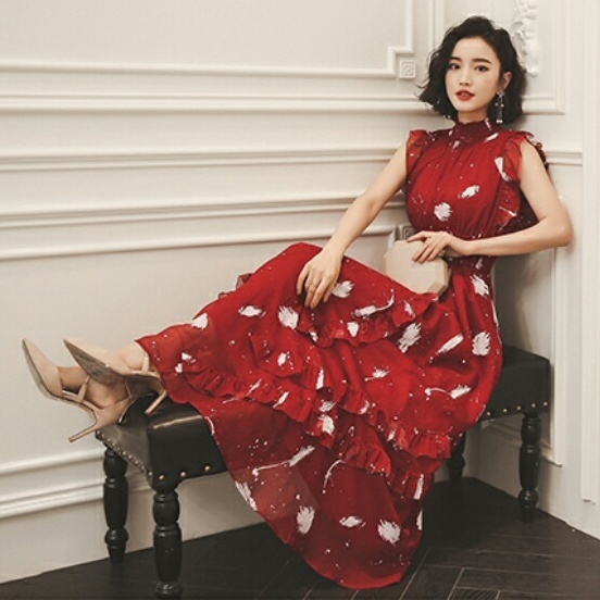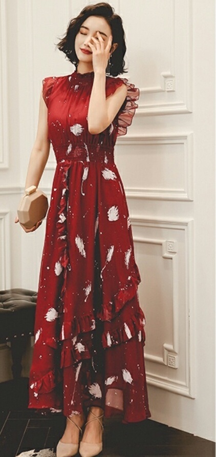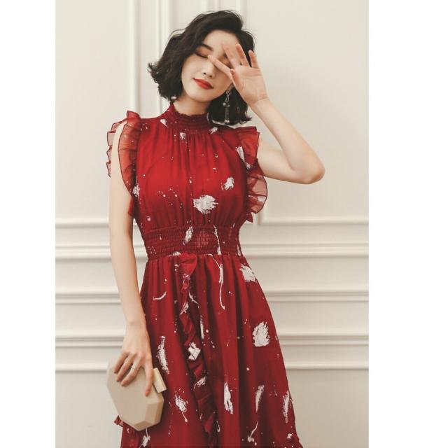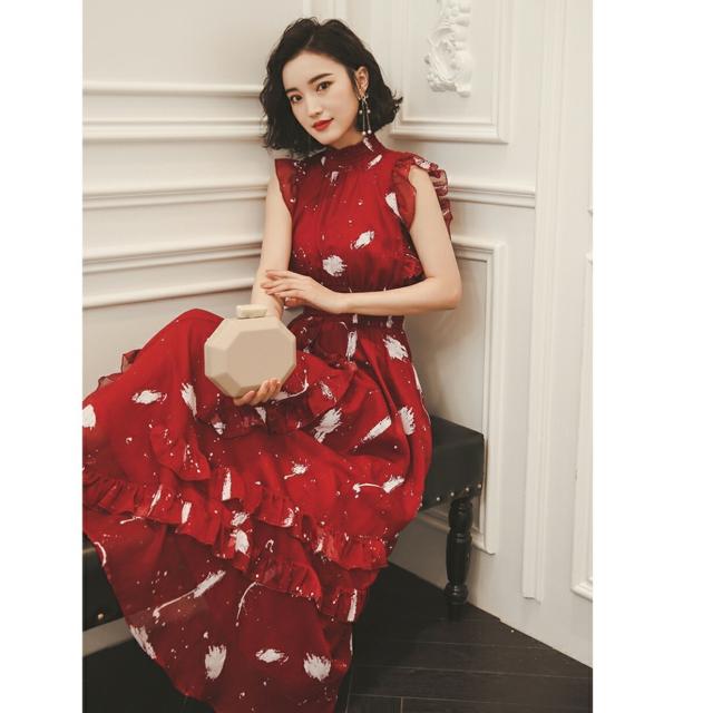 フリル ロング フレアドレス ハイネック ノースリーブ 可愛い