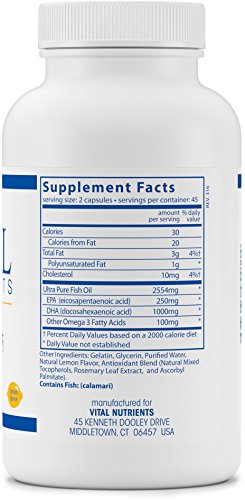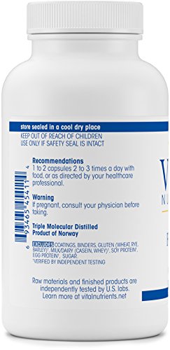 Ultra Pure Fish Oil 675 High DHA is sustainably sourced using highly selective and environmentally safe fishing methods. Growing scientific evidence suggests that DHA is the most preferential Omega-3, with DHA comprising 95% or more of the Omega-3 fatty acids found in the brain and eyes. Blood levels of DHA are 3-4 times higher than EPA, making this product helpful for maternal and childhood development, as well as brain development, and eye and cardiovascular health. DHA can also help prevent inflammation in the body, as well as assist in healthy aging. Ultra Pure Fish Oil 675 High DHA softgels have a pleasant lemon flavor. Vital Nutrients mission is to manufacture superior quality nutraceuticals that exceed both industry and government standards and provide clinically effective results. They provide over 200 science-based and clinically effective products. They have a comprehensive quality assurance program to ensure that purity and potency is consistently met on every product that they manufacture. Vital Nutrients uses independent U.S. ethical laboratories to test all raw materials and finished products. Each raw material is tested, regardless of origin, for purity and potency. All finished products are tested through a real time stability protocol for expiration date validation. They are an FDA Inspected facility that exceeds FDA cGMPs, and a member of the NPA.Feature