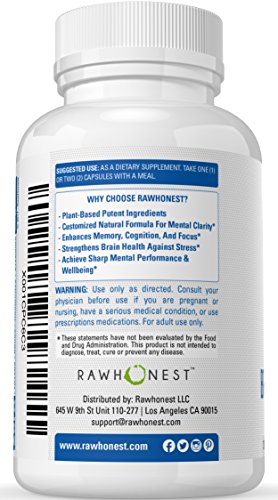 Enhance Your Memory, Focus & Clarity With The Most Natural Dietary Supplement! Are you sick and tired of feeling stressed, anxious and mentally drained?Do you have big exams coming up and need an extra boost? Presenting The RawHonest Natural & Healthy Brain Booster! Our advanced formula is enriched with hand-selected, natural botanicals known for their brain-boosting powers. Reduce stress, anxiety and promote focus, clarity and cognitive function with the ultimate brain booster!The Perfect Supplement To Get A Mental Edge! The RawHonest natural brain booster will not only enhance your cognitive function but also stimulate blood flow to your brain, thus maximizing clarity and empowering you to easily perform challenging tasks and exercises!We believe in providing you with natural and healthy dietary supplements to make your life easier! Nature's Most Beneficial Super-Ingredients In A Single, Convenient Capsule! Here are some of our healthy and natural botanicals and ingrediens: Bacopa Monnieri is believed to support the protein network that transmits signals amongst neurons and promotes healthy neuron recovery. Rhodelia Rosea Extract is a Russian super-herb that optimizes mental performance, reduces stress levels and helps you be positive and focused on important tasks. Grapeseed Extract helps rejuvenate brain cells and protects your brain from fatigue and memory lossPhosphatidylserine encourages the release of serotonin and dopamine while enhancing thinking skills and promoting focus Enhance Your Concentration & Maximize Your Productivity! The RawHonest premium brain capsules are the perfect boost for a busy day! Our brain booster is ideal for students who need to enhance their focus, busy entrepreneurs who have a hectic lifestyle and seniors who are facing the first signs of memory loss.Even die-hard gamers can benefit from the enhanced cognitive function and boost their performance! Why Wait Any Longer?Feature