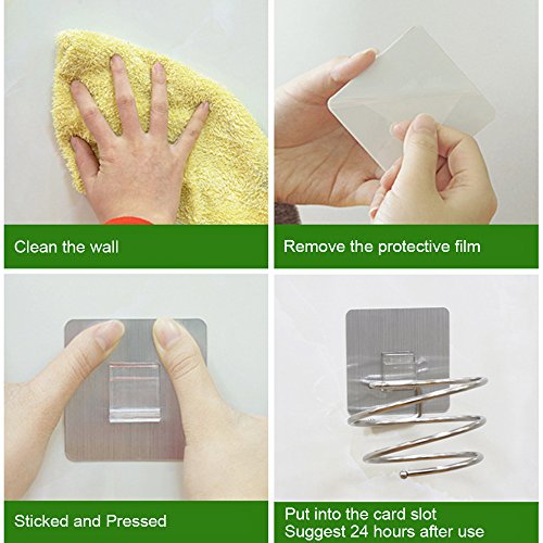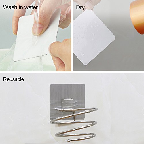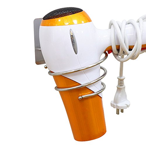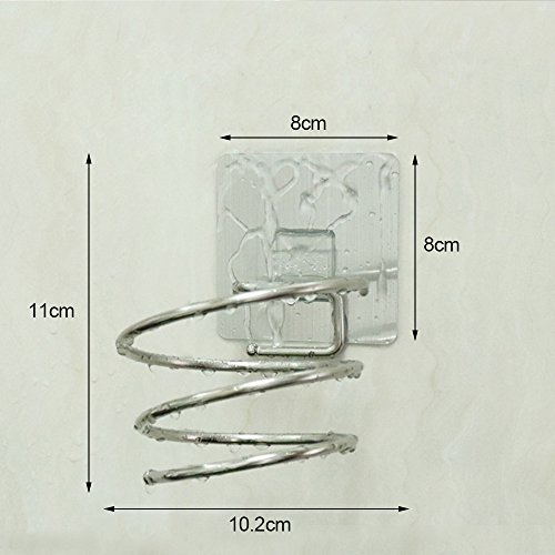 - Space Saving & Reusable: Spring style hair dryer holder rack, saving space and keep dryer in order, suitable for bathroom and washroom.Super strong adhesive strength, a single hook bearing about 17 lb/ 8 KG. Works on a variety of surfaces, like wood, tile, Ceramic ,Metal Surface and more.