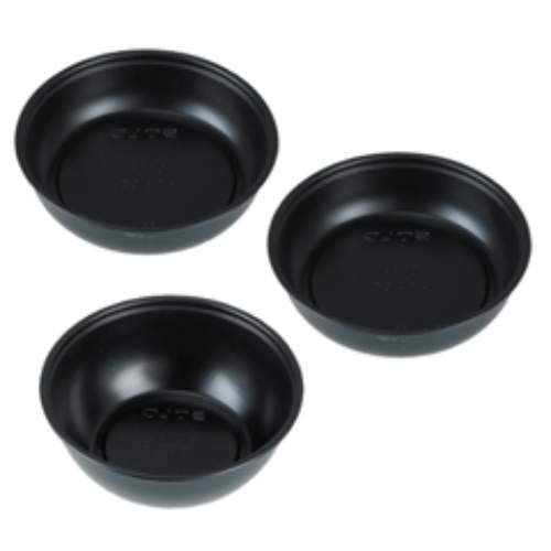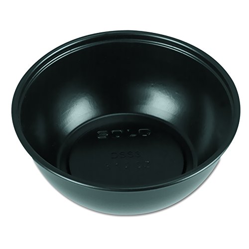This SOLO DSS2-0001 2.5-oz. black plastic container measures 3.2 x 0.8 inches (Dia x H) and is suitable for serving dipping sauces and side dishes. (Dia is diameter, the horizontal distance from one side to the other; H is height, the vertical distance from bottom to top.) The container is made of polystyrene for strength and flexibility and can be used for serving hot or cold foods. This 2.5-oz. black plastic container is suitable for use a variety of food service settings.