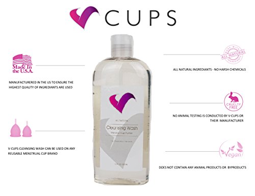 V-CUPS menstrual cup cleaner wash -12oz bottle (best value in the industry) -100% all natural ingredients -compatible with all reusable menstrual cup brands including diva cup, Lena, super Jennie, blossom and lunette -multi-purpose solution, can be used as a body gel or face wash as well -cruelty free & vegan incorporate our V-CUPS cleansing wash into the monthly care and maintenance routine for all of your feminine hygiene products. Our easy-to-apply clear gel creates a thick later that cleans away stains and odors, can be used on reusable menstrual cups or pads, sponges or discs. We offer the best value in the industry with our 12oz bottle V-CUPS gentle yet effective solution will cleanse your period cup and not harm the delicate skin of your vagina. V-CUPS cleansing wash does not contain any harsh chemicals, BPA's, paragons or sulfates. Increase the lifespan of your menstrual cup today with our cleansing wash.Feature