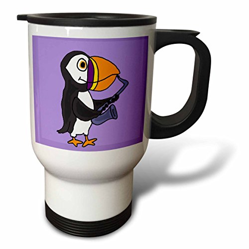3dRose tm_200456_1 Fun Puffin Bird Playing Saxophone Stainless Steel Travel Mug, 14 oz, White