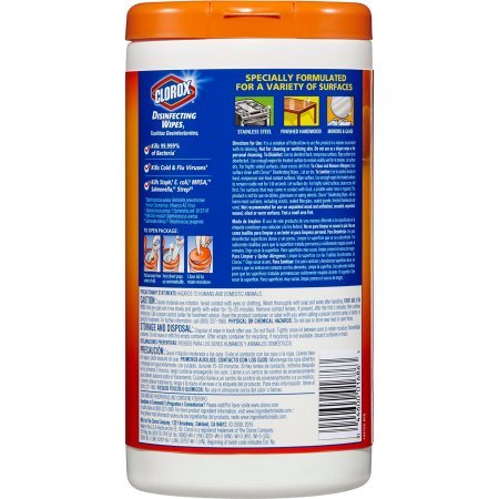 -. Feature : 75 count canister of disinfecting wipes in Orange Fushion / Kills 99.999% of bacteria, including Human Coronavirus and Influenza A2 Virus / Kills cold and flu viruses, E. Coli, MRSA, Salmonella, Staph, and Strep / Remove more than 99% of allergens like car and dog dander, dust mite debris, and pollen / Clear drying formula powers through grease, soap scum and grime