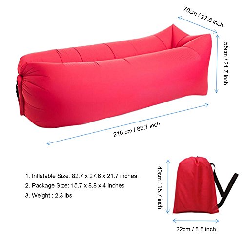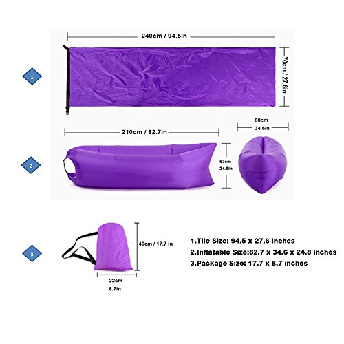 Studio : BRY Publisher : BRY Product Description ◎ Inflated Size: 200 x 70 x 55cm (78.7 x 27.6 x 21.7 inches) ◎ Package Size: 40 x 7 x 22cm (15.7 x 2.7 x 8.8 inches) ◎ Weight: 2.2lbs ◎ Support up: 440 lbs ◎ Material: 210T Waterproof Oxford cloth ◎ Color: Black,Blue,Red,Purple,Green,Pink ◎ Package Includes: Air Lounger Sleeping Sofa x 1,Carrying Bag x 1