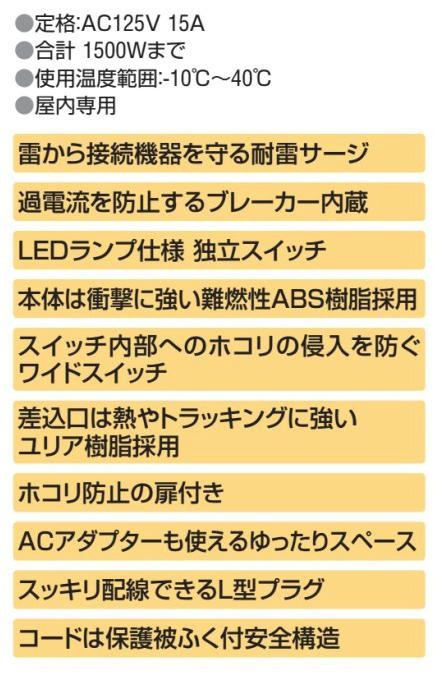 雷から接続機器を守る耐雷サージ機能付きの、スイッチ付タップです。過電流を防止するブレーカー内蔵。