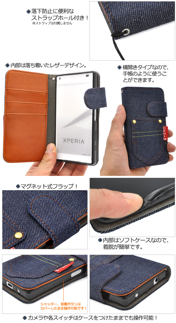 衝撃やキズなどからXperia Z5 Compact SO-02Hを守ります。 内部ケースはソフトケースなので、着脱が簡単です。 男女どちらでもお使いいただける、スタイリッシュなデニムデザイン。 内側は落ち着いたレザーデザインです。 背面を折り返すとスタンドとして使用できるので、動画視聴に便利です。 落下防止に便利なストラップホール付きです。 横開きタイプなので、手帳のように使うことができます。 また、内側に3つのカードポケットとサイドポケット付きです。 ※Xperia Z5 Compact SO-02Hは付属しません。 ※ライセンス商品ではありません。 | ||||||||