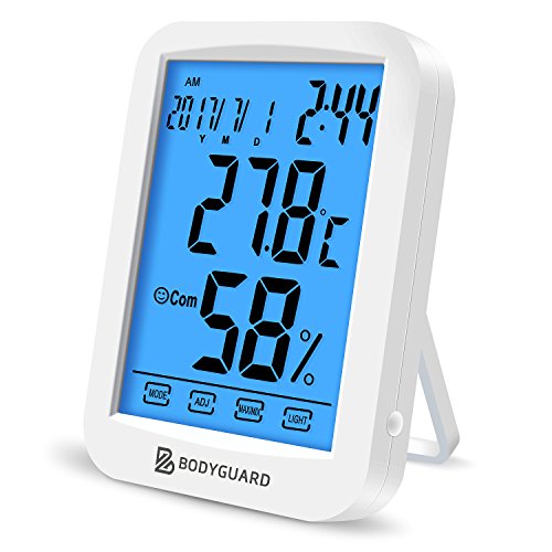 -. Feature : 【様々な機能】温度・湿度・日付け・アラーム・快適度アイコン等の機能は同時に搭載し、一目で室内温湿度をしっかりと掌握でき、全面的にお生活を守れます。 / 【タッチスクリーン搭載】タッチスクリーン機能付きで、簡単に日付や時間などの設定が変更できます。また、バックライト付きで、薄暗い所でも設定と読むのは便利になります。 / 【温湿度記憶】最高、最低温湿度が自動的に記憶でき、12時間表示/24時間表示に切り替えます。お使い方とご習慣により、自由にお選びいただけます。 / 【健康管理】家族の健康管理、インフルエンザや風邪などの予防対策、お肌への潤い環境チェック、カビ対策、熱中症対策などにも参考になって役立ちます。 / 【安心便利】コンパクト・シンプルデザインなので、卓上スタンド・マグネット・壁掛け用フック穴が付いているので、自宅の様々な場所に設置出来ます。Bodyguardからご購入の場合、メーカーの1年間保証が付いています、1年保証期間内の故障は、当社に連絡を下されば責任を持って対応致します。