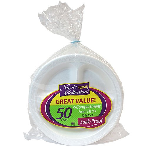 Nicole Home Collection 50 Count Everyday Dinnerware 3-Compartment Foam Plate, 10-Inch, White