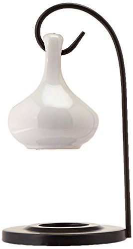 - With a generous dollop of charm, this striking oil warmer will mesmerize you with its simple elegance. A metal loop balances the ceramic oil basin above a seated tealight to give off a warm glow and delicate scent. Specification Item weight: 0.5 lb. 4" x 4" x 7 5/8" high. Porcelain with metal stand. Tealight candle and oil not included. UPC: 849179003081.
