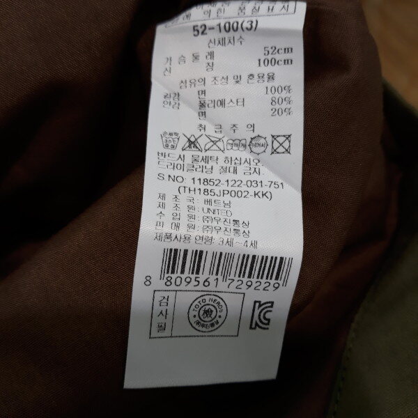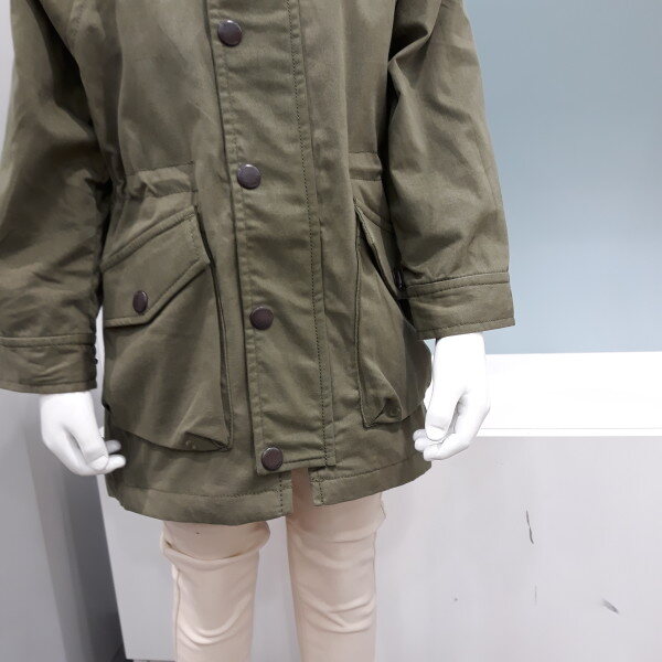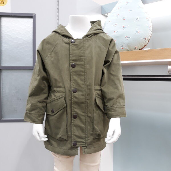 기모된 겉감과 배색안감으로 두께감있는 아우터.카키와 브라운의 스냅배색이 포인트.허리조절이가능하며 남녀공용