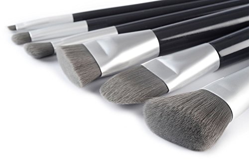 Brushes include: angled blush, foundation brush, precision sweep brush, angled concealer brush, eye shadow brush, angled eyeliner brush.
