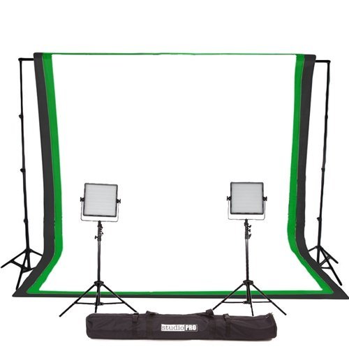 Studio : StudioPRO Publisher : StudioPRO Binding : Electronics Product Description Technical Specs (2) 7'6" Professional Quality Aluminum Adjustable Light Stand Height: Adjustable from 2'3" - 7'6" Weight: 2.5 lbs Closed Length: 27" Stem: 5/8" Stem Screw: 1/4" Foot print: 2'4" Base Tube Diameter: 1.5" Die Cast Aluminum Construction Quick and Easily Fold Slip Resistant Rubber Tipped Legs Black Non-Glare Finish Quick Release Levers for Smooth Height Adjustments (2) StudioPRO Premium Daylight LED 600 Light Panel Aluminum Casing (S-600D) Model Number: S-600D Daylight 5600K balanced light output Dimmable, flicker free dial Includes diffusion filter, amber/orange filter Weight: 8 lbs LED Count: 600 CRI > 90 Illumination: 6800 LM at 1 meter 6800 Lux at 1 meter distance 1800 Lux at 2 meter distance 780 Lux at 3 meter distance Wattage: 36W V-lock battery compatible Power adapter included 100V-240V Panel Dimensions: 15.5"x3"x16" (1) Background Support System 3 sections extends to 10' wide Adjustable background support stands extend 7'6" tall Holds muslin, canvas, or paper rolls Disassembles quickly and easily Includes padded carrying case for components (1) Black, (1) White, and (1) Green Muslin Background 100% Cotton to absorb the light and eliminate reflection Seamless; made from one piece of material 3" pocket on one end for hanging Machine washable; allow 5-8% shrinkage Crimped along edge to prevent tears Includes (1) Black, (1) White, and (1) Green Muslin. 0