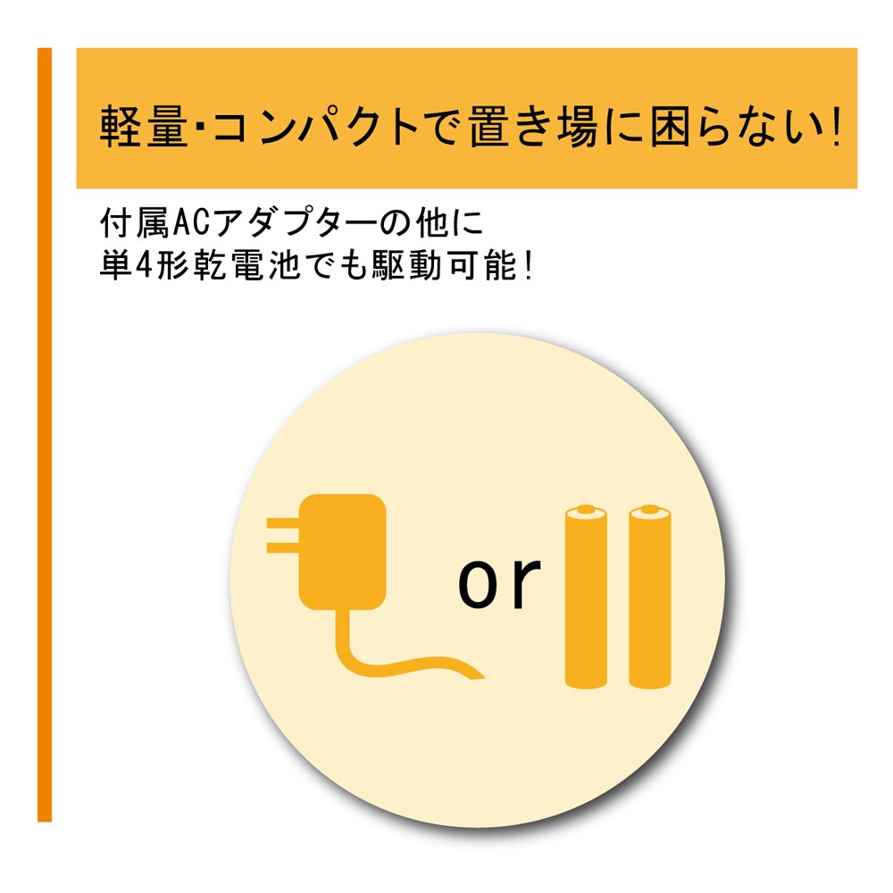 Besides the supplied AC adapter, it is also driven by AAA alkaline batteries.