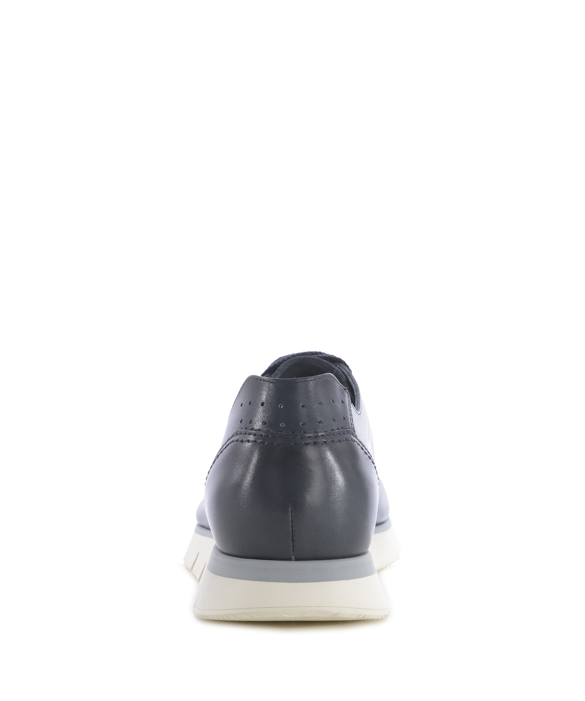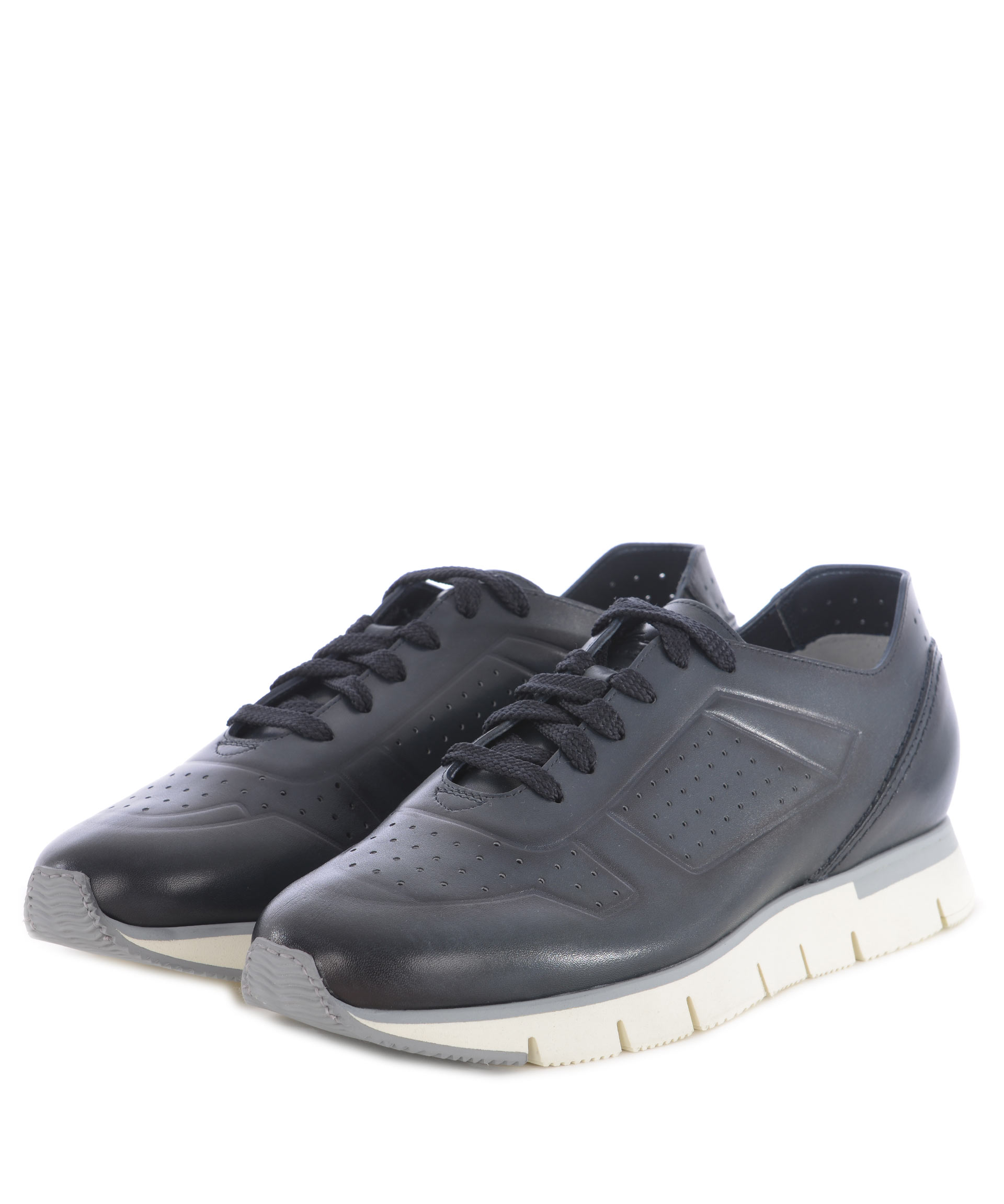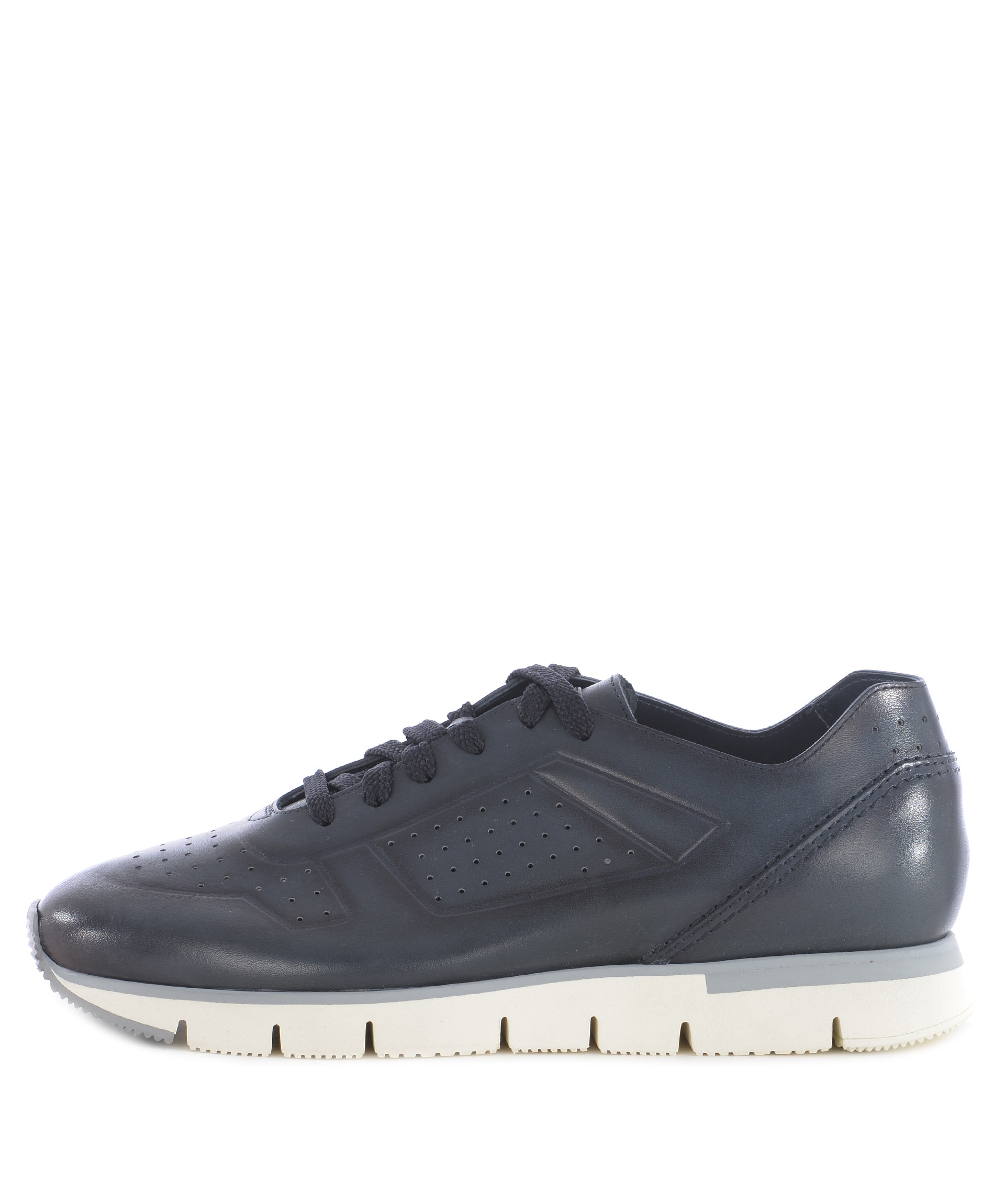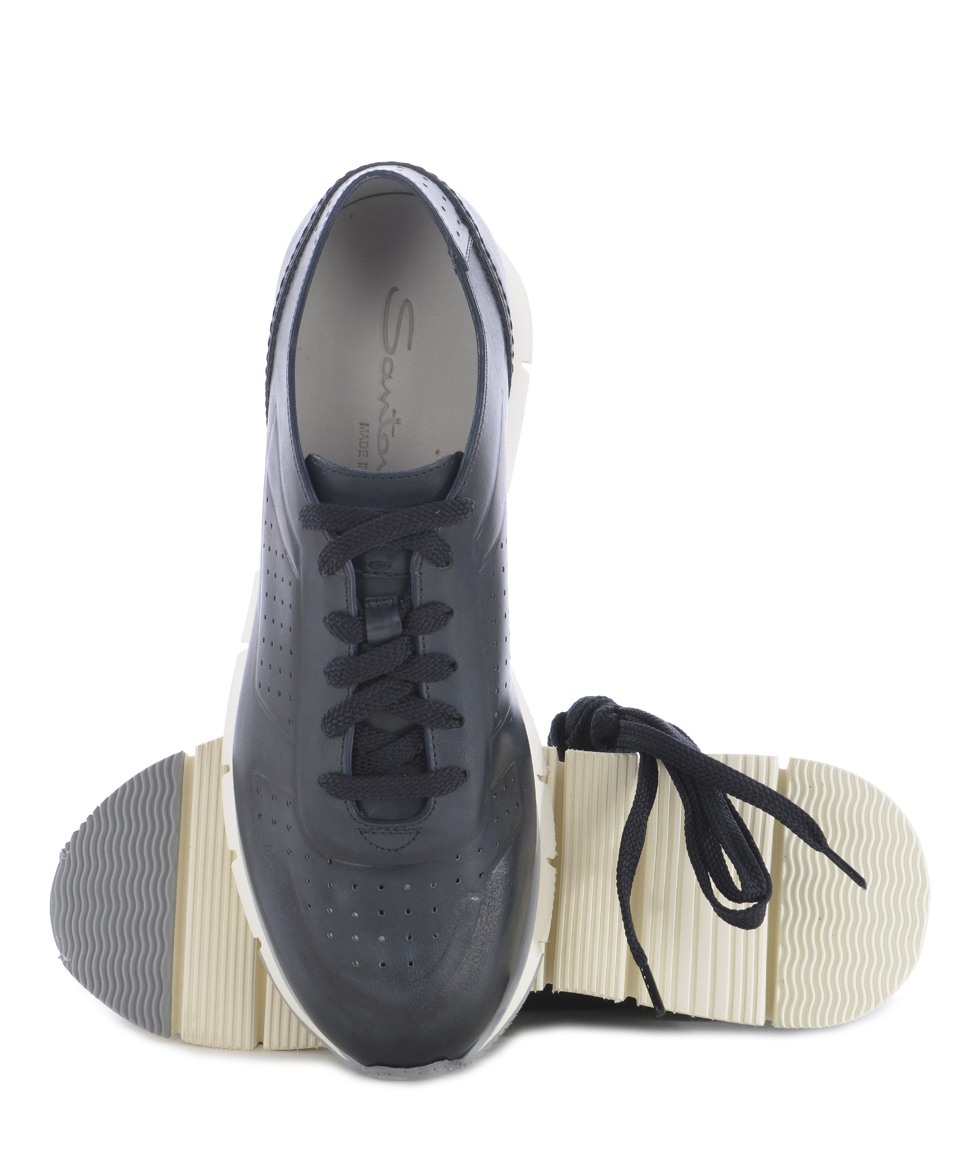 Sneakers Santoni in pelle spazzolata Blu scuro. Aree con colorazione disomogenea. Forate ai lati e alla punta. Stringate. Lacci di ricambio. Sfoderate. Suola 30 mm in gomma. Misura in foto 6 100% pelle