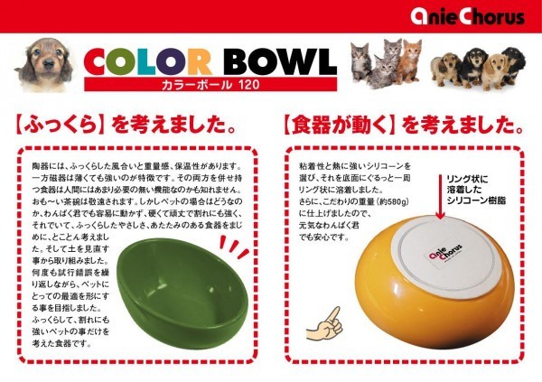 わんぱく君でも容易に動かさず、硬くて頑丈で割れにも強く、それでいて、ふっくらしたやさしさ、あたたかみのある食器をまじめに、とことん考えました。ふっくらして、割れにも強いペットのことだけを考えた食器です。粘着性と熱に強いシリコーンを底面にぐるっと一周リング状に溶着しました。こだわりの重量(約580g)に仕上げましたので、元気なわんぱく君でも安心です。 |