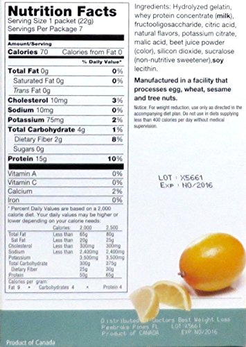 -. Binding : Health and Beauty -. Brand : Proti Wise -. EAN : 0753677576070 -. Feature : High Protein - 15 grams Per Serving / Low Calorie - 70 Calories Per Serving / Medical Grade - Sold in many Weight Loss Clinics / Fat Free and Sugar Free / Easily Mixes with Water -. IsAdultProduct : 0 -. Label : Doctors Best Weight Loss -. Manufacturer : Doctors Best Weight Loss -. PackageQuantity : 7 -. ProductGroup : Health and Beauty -. ProductTypeName : HEALTH_PERSONAL_CARE -. Publisher : Doctors Best Weight Loss -. Studio : Doctors Best Weight Loss -. Title : ProtiWise - Pink Lemonade High Protein Diet Drink (7/box) -. UPC : 753677576070