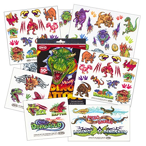 -. Feature : Savvi Dinosaur Temporary Tattoos Party Favor Pack - Over 50 Tattoos. Featuring your favorite dinosaurs including T-Rex and more! / Dinosaur tattoo pack contains over 50 temporary tattoos. Perfect to hand out or apply at Jurassic World parties. / Perfect as dinosaur birthday party supplies, party favors, temporary tattoos, motivational awards and more! / Colorful dinosaur temporary tattoos feature colorful dinosaurs. / The perfect gift for any dinosaur or Jurassic World fan!