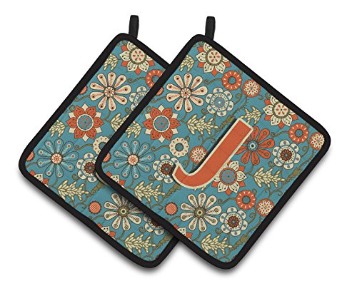 Caroline's Treasures Letter J Flowers Retro Blue Pair of Pot Holders CJ2012-JPTHD, 7.5HX7.5W, Multicolor