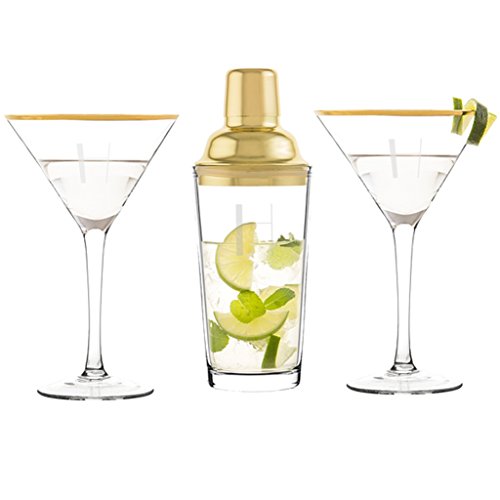 -. Binding : Kitchen -. Brand : Cathy's Concepts -. Color : Clear/Gold -. EAN : 0694546598086 -. Feature : One (1) 20 oz. Gold Cocktail Shaker and two (2) 10 oz. Gold rim martini glasses. / Shaker: 8.75" H. with a 3.3" diameter; holds up to 20 oz. / Martini glasses: 4.75" diameter (at top of bowl, tapers to a 1.5" diameter) x 7.25" H. Holds up to 10 oz. / Gold-plated. Rubber. Glass. Please note: minor bubbles and swirls are inherent to hand-blown glass. / Hand-wash only. -. Label : Cathy's Concepts -. Manufacturer : Cathy's Concepts -. Model : S2313G -. NumberOfItems : 3 -. PackageQuantity : 1 -. ProductGroup : Kitchen -. ProductTypeName : KITCHEN -. Publisher : Cathy's Concepts -. Size : 10oz + 2- 20oz -. Studio : Cathy's Concepts -. Title : Cathy's Concepts Gold Cocktail Shaker And Martini Glasses -. UPC : 694546598086