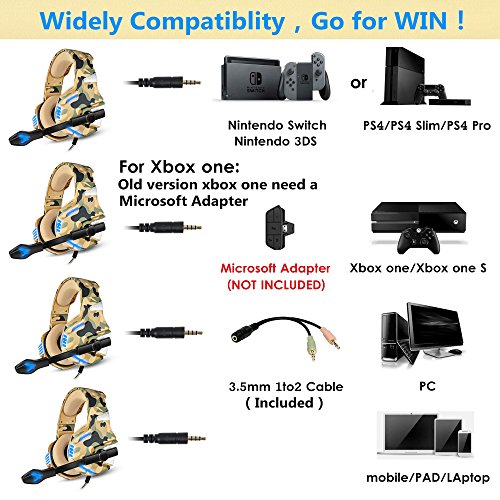 ❖Excellent Compatibility❖ Support PS4, new Xbox One, PC, laptop, Nintendo switch, PSP, tablet, mobile phone, but you need a Microsoft Adapter (Not Included) to connect with Xbox One of old version. Adjustable Headband for different sizes of head, suitable for both adults and children. Perfectly meet your demands for gaming, working, on-line chatting, broadcasting or recording.