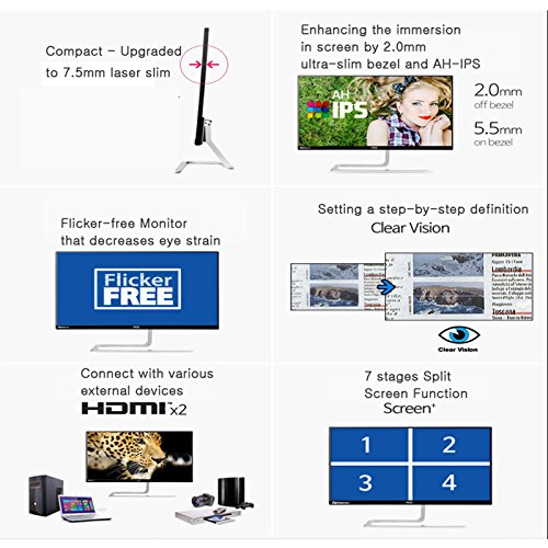 -. Feature : Screen Size : 24 inch(60.5cm) / Display Screen Size : 527.04 x 296.46mm / Power : AC100-240V, 24V/3.75A, 50Hz/60Hz (Europe/Asia C,F plug type (two round pins) / Size (WxHxL) : 533 x 400 x 150 mm (with stand) / Weight : 5.0kg / Flicker-free Monitor that decreases eye strain / Enhancing the immersion in screen by 2.0mm ultra-slim bezel and AH-IPS