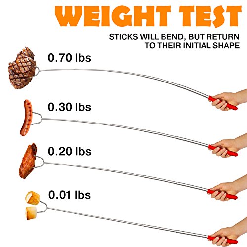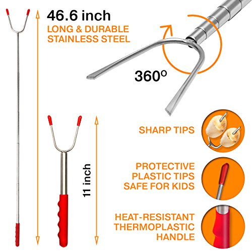 ✓ EXTRA LONG ROASTING STICKS! This extra-length telescoping handle on your Long Roasting Sticks makes cool work of flame-cooked delights! Expanding from comfortable 11'' to a generous 46.4-inch length, these handles stay nice and cool. The forks cool down rapidly so you can dig in without too much wait!
