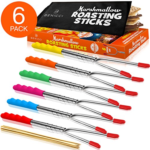 ✓ STICKY S’MORE SMILES MADE SAFER: Kids go crazy over these 6 brightly colored Marshmallow Extending Roasting Sticks. And with our sturdy Extra Length 46.4-inch telescopic handle they’re both easy to use and safe! Store your roasting forks securely with PVC safety caps, and a protective carrying case. FDA approved.
