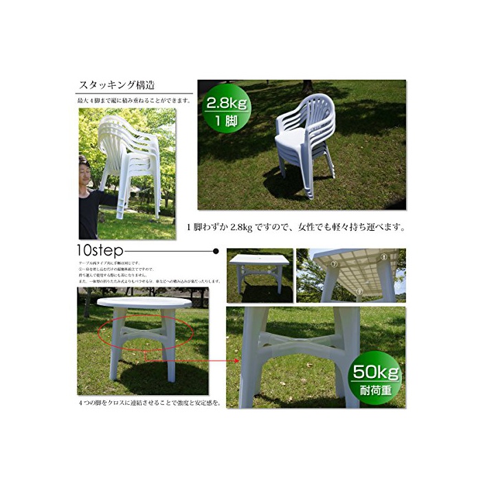 상품 상세:■ 사이즈 (약) 가든 체어 폭54cm/높이77cm(좌면까지의 높이45cm)/(길이)깊이45cm 가든 테이블 환테이블 (책상이나 카운터의) 널찍하고 평평한 윗부분 직경91cm (책상이나 카운터의) 널찍하고 평평한 윗부분 두께4.5cm 높이75cm 가든 테이블 각테이블 (책상이나 카운터의) 널찍하고 평평한 윗부분110×56cm (책상이나 카운터의) 널찍하고 평평한 윗부분 두께4.5cm 높이75cm ■ 소재 : 폴리프로필렌 ■ 내하중: 테이블/약50kg 체어/90kg ※테이블을 동그라미/뿔로부터 선택해 주세요.