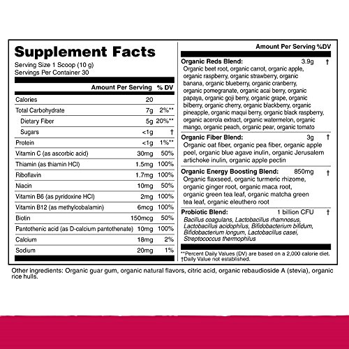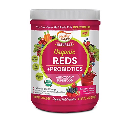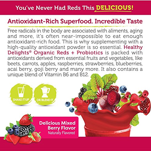 Healthy Delights Naturals Organic Reds Probiotics is the super food powder that mixes up easily into a delicious and powerfully nutritious drink. As good for your stomach as it is for the rest of your body, Organic Reds Probiotics features a Organic Fiber Blend and a Probiotic Blend that works synergistically to promote healthy digestion and balanced gut health.* Feel an energy boost thanks to the maca root, matcha green tea leaf, ginger and turmeric in our Organic Energy Boosting Blend.* Packed with antioxidants derived from beets, carrots, apples, raspberries, strawberries, blueberries, acai berry, goji berry and many more, Healthy Delights Naturals Organic Reds Probiotics packs powerful nutrition in every scoop. You will feel the unique blend of Vitamin B6 and B12 working to naturally boost energy when you need it most. Antioxidant-Rich Super Food Super Drink Healthy Delights Naturals Organic Reds Probiotics harnesses the power of the most sought-after antioxidant-rich superfoods into a deliciously convenient and energizing drink. Sip your way to a full day’s supply of antioxidants with a boost of natural energy. Get 1 billion CFUs of probiotics‡ to ease digestion and improve overall gut health* ? plus vitamins and minerals too. This delicious, all-in-one antioxidant formula has only 20 calories with 1 gram of sugar. Delicious enough to drink every day Healthy Delights Naturals Organic Reds Probiotics provides a powerfully delicious spectrum of organic vegetables including beet root, carrot, apple, raspberry, blueberry, cranberry, pomegranate and more. This unbelievably healthy ingredients combine in a Delicious Mixed Berry Flavor you are going to want to drink every day! 0 |
