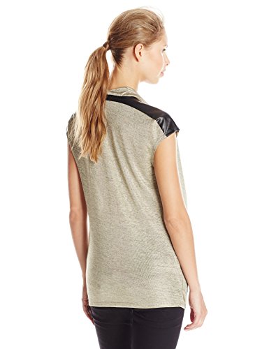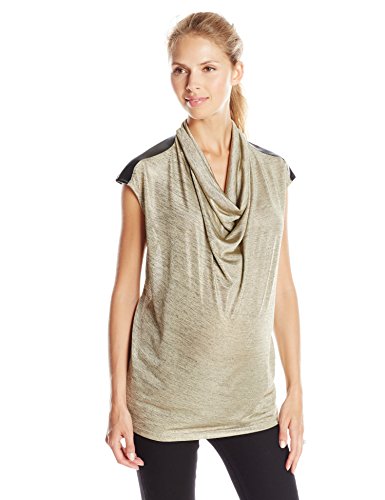 Look like a million bucks in that metallic gold drape tee with pleather shoulder patch.