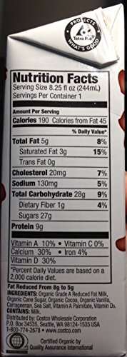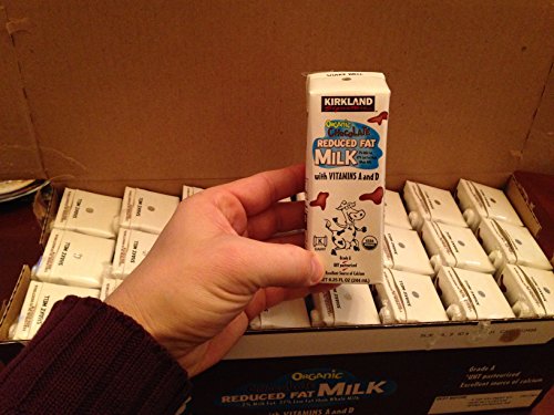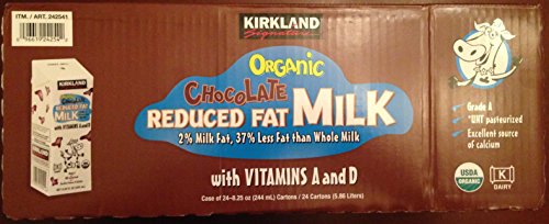 -. Feature : Kirkland Signatures 2% Organic Chocolate Milk. Pack of 24 / 8.25 Oz. Ea. / Vitamin A and D added. Refrigeration not needed. Exp 11/2014 / No high fructose corn syrup / 9 g of protein and 190 calories per 8.25 oz carton / Grade A; Reduced (2%) milk fat