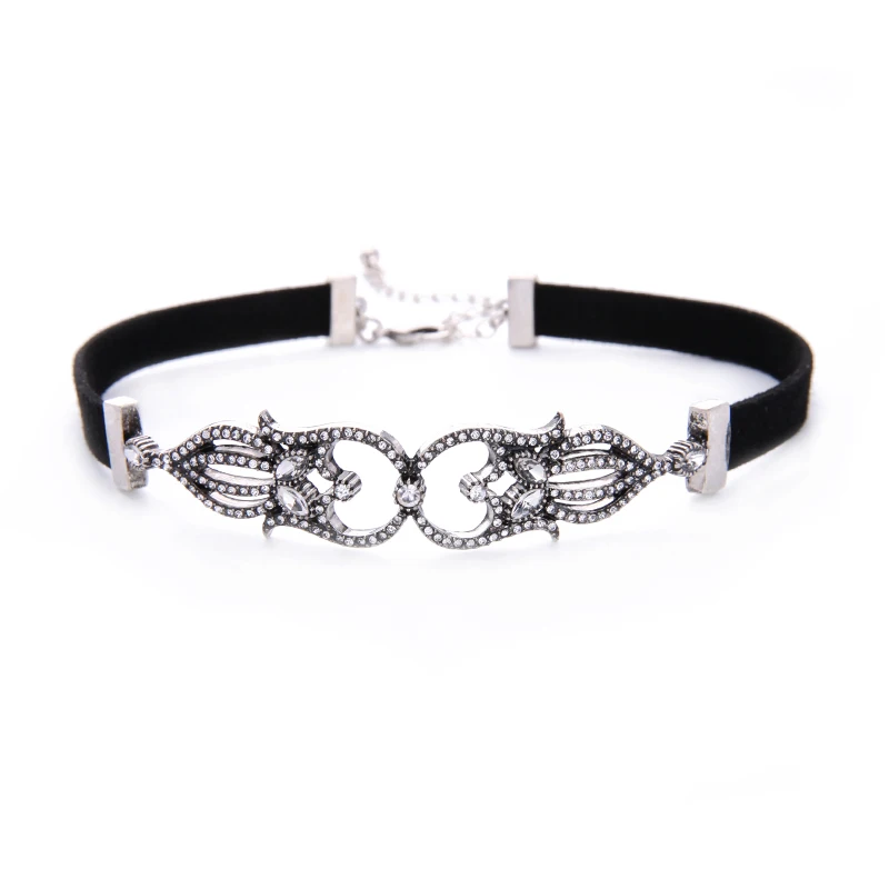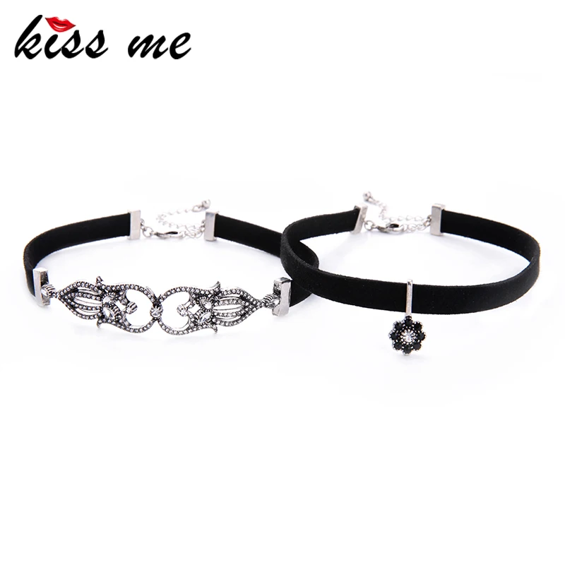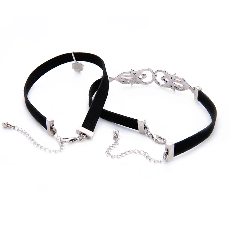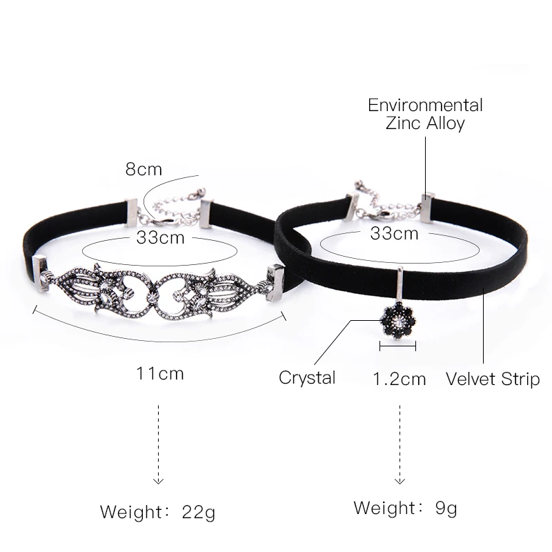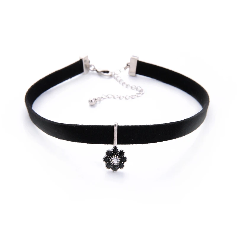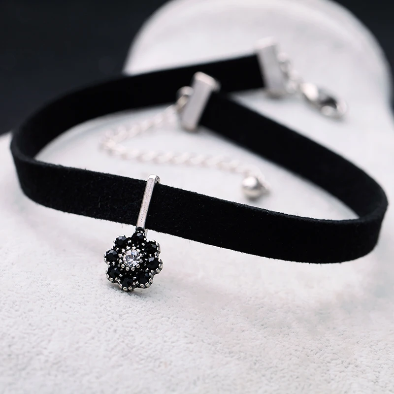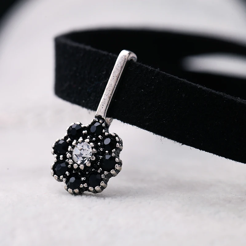 Production name ::2 Pcs/Set Black Imitation Leather Geometric Crystal Flower Choker Nec