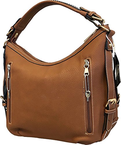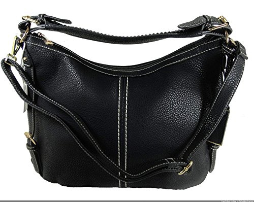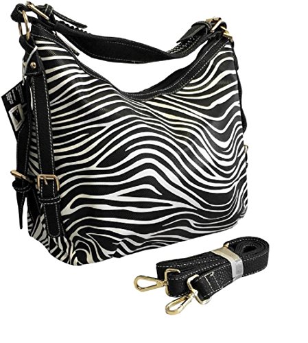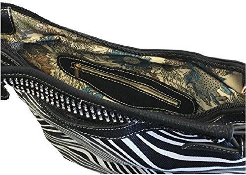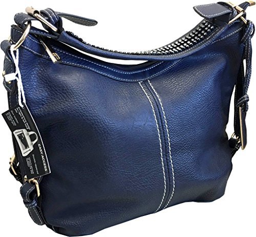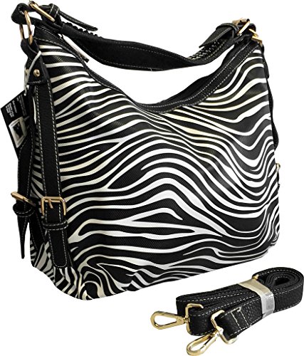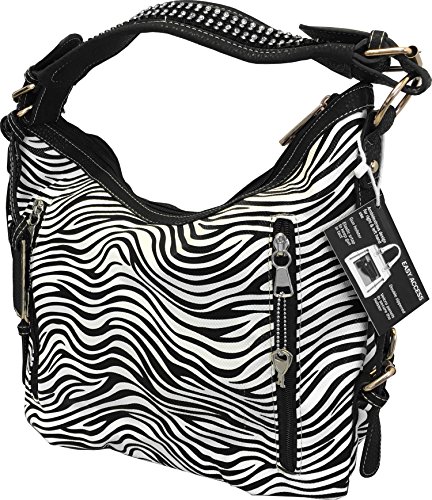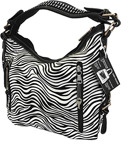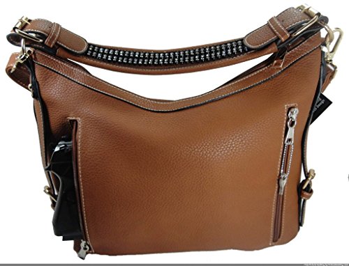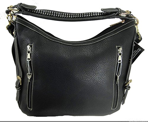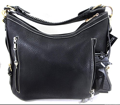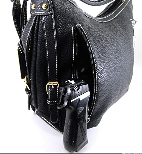 Product Description This spacious concealed carry gun purse is done in vegan leather and feaure easy locking gun concealment! The gun compartment offers both left and right hand access with locking zippers and a set of two keys. Strong velcro fastenings are on the inside of the gun pocket as well as on the adjustable and removable holster which is incuded. It comes with two straps which gives you the option of a shoulder or cross body carry. The cross body strap easily clips on/off, while the shorter strap features clear sparking rhinestones. The roomy main compartment is designed with a middle divider that has a zipper pocket for loose change or small items. 0