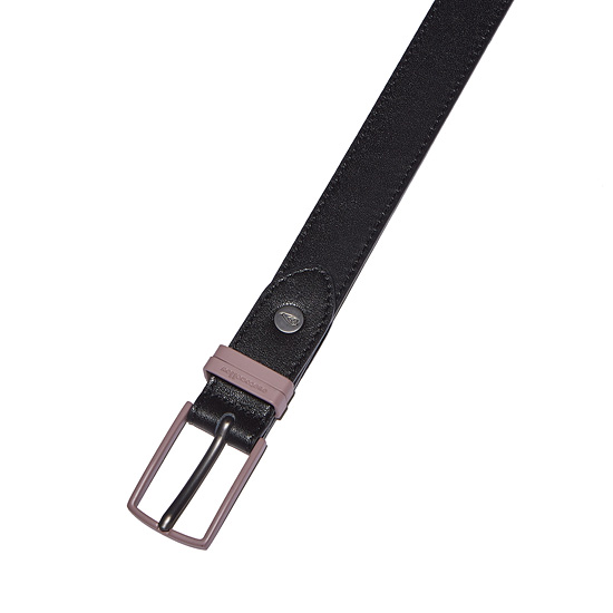 - 버클과 금속가락지가 핑크 컬러인 슬림한 남성 벨트.