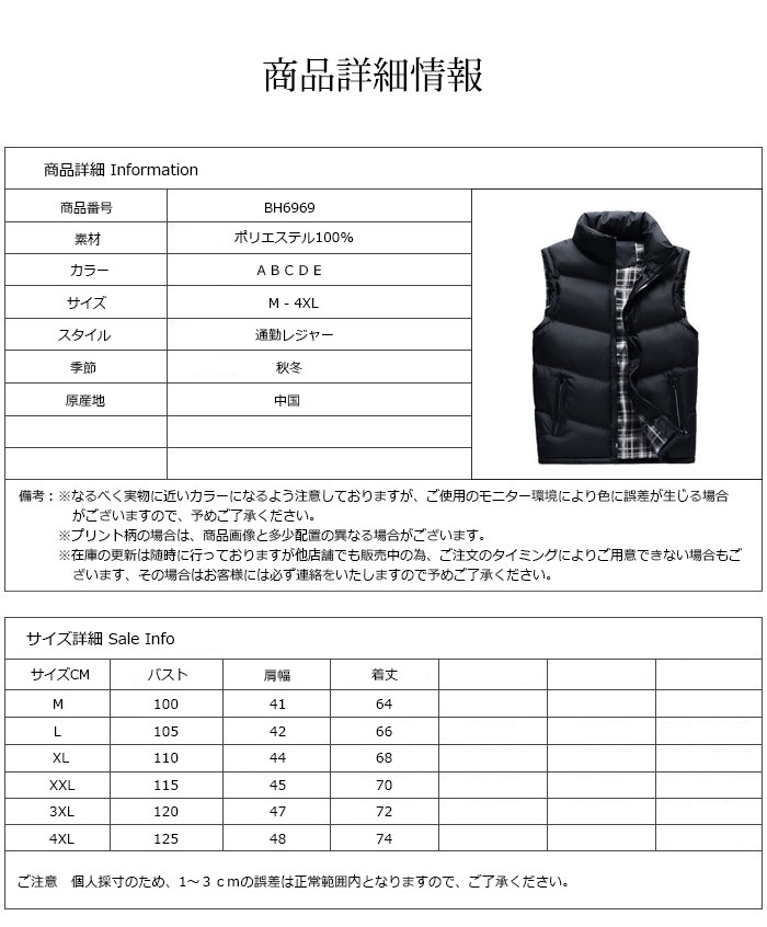 ■ 素材 : ポリエステル■ サイズ(cm)Mバスト100肩幅41着丈64Lバスト105肩幅42着丈66XLバスト110肩幅44着丈682XLバスト115肩幅45着丈703XLバスト120肩幅47着丈724XLバスト125肩幅48着丈74