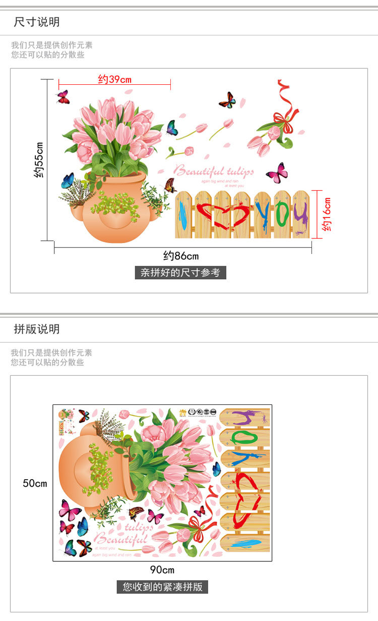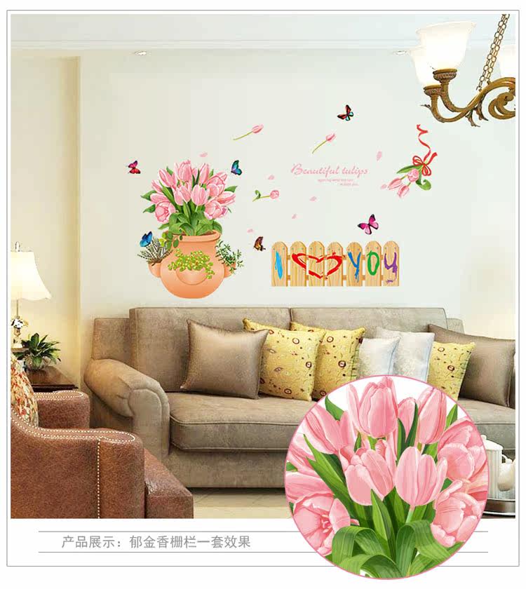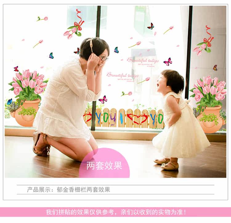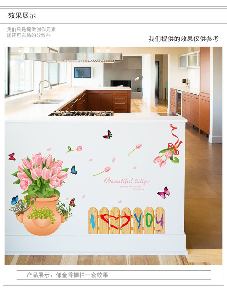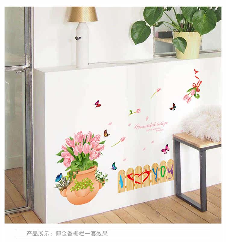 玄关装饰墙贴郁金香盆栽栅栏腰线贴可移除贴纸客厅卧室背景贴花卉