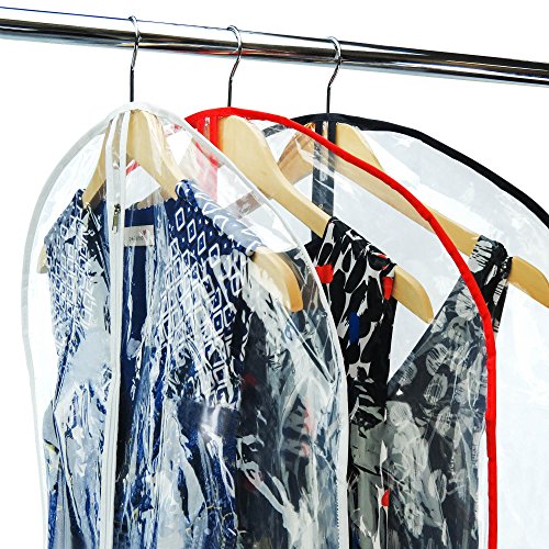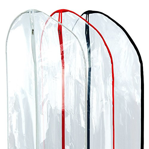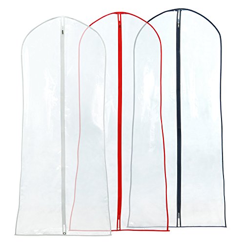 -. Feature : Pack of 3 Clear Long Dress Covers with Full Length Zip. Size 72" long x 24" wide approx. Sealed at lower edge. Mixed colored trim, red, white or blue. / Made from clear 0.10mm showerproof peva - wipe clean - Ideal length for coats, dresses, skirts, pants, suits, shirts, tops, jumpers etc. / Shaped shoulders - Top hole for hanger hook - Lower grommet for hanger hook - enables easy carrying whilst folded in half. Wipe clean & showerproof. / An ideal everyday garment cover for storage & travel. Excellent value. Protects clothes against dirt, dust & moths. / Trusted Hangerworld Brand - supplied in Hangerworld Packaging as pictured. Also listed in shorter lengths.