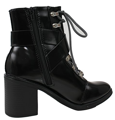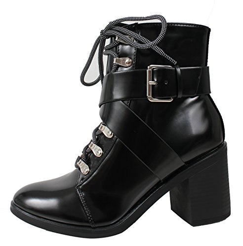 (City Classified)/Women's/Boots/DIRECT FROM USA/City Classified Women's Military Combat Lace Up Criss Cross Buckle Strap Block Heel Ankle Boot