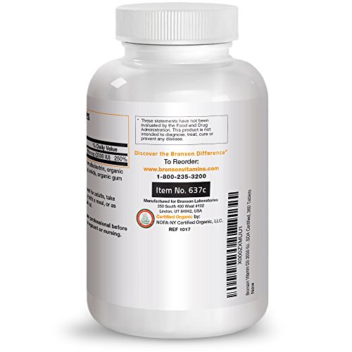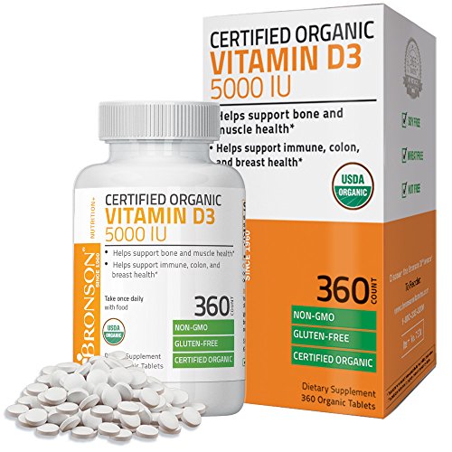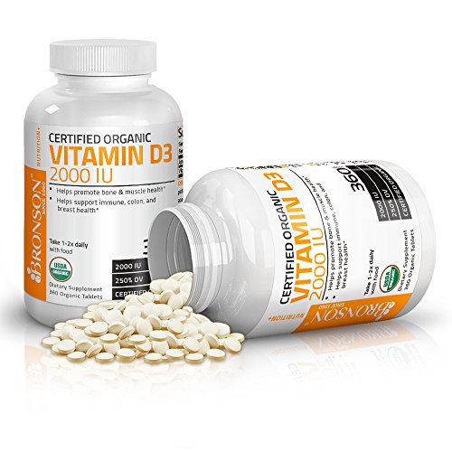 USDA Certified Organic Vitamin D3 - An Excellent Way to Help Replenish Vitamin D Levels. Vitamin D is a fat-soluble nutrient that is produced through skin exposure to sunlight, which triggers vitamin D synthesis. Despite the importance of the sun to vitamin D synthesis, many experts agree it is wise to limit sun exposure to the skin, which often results in lower than ideal Vitamin D levels in the body. Vitamin D supplements are another option for helping to replenish vitamin D status. Each tablet of Bronson Organic Vitamin D supplies 2000 IU of Vitamin D3, the preferred form. Research has shown that Vitamin D supports bone, immune, colon, muscle, and breast health.* Vitamin D supplements are an excellent way to help replenish vitamin D levels.Feature