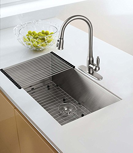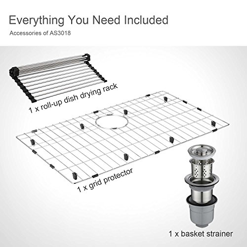 Kitchen Sink Accessories: 1 pc of basket strainer, 1 pc of sink protector, 1 pc of roll-up dish drying rack and all mounting hardware