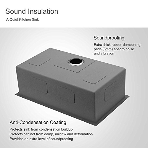 Sound Insulation: Extra-thick rubber dampening pads (3mm) absorb noise and vibration; Anti-Condensation Coating: Protects the sink from condensate, protects the cabinet from damp, mildew and deformation, and provides an extra level of soundproofing