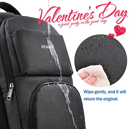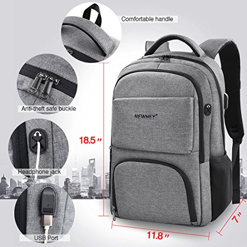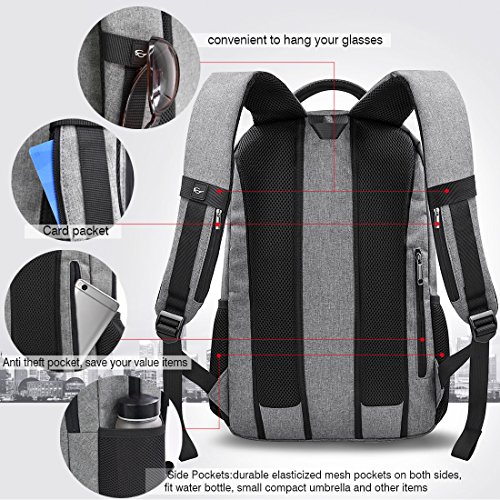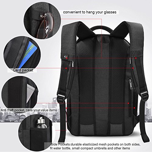 * Earphone hole. * Reinforce straps. * Water resistant material, keeping laptop dry in light rain. * Anti theft pocket protects your value items. * Soft laptop backpack holds 15.6inch laptop backpack. * Durable metal zippers ensure a long lasting usage for you. * Two "S" Curve padded shoulder straps talks you a comfortable wear feeling. * External USB port with built-in charging cable offers a convenient charging of your phone anywhere. But please note that the backpack itself doesn't have power, and you need to put a USB charger inside by yourself. * 18 pockets offer a main space for your laptop(15.6inch or smaller), notebook, clothes, iPad and so on. The outside two pockets for your umbrella and bottle, easily find them when you need. And the anti theft pocket holds your value stuffs, such as wallet and keys. * 3D ventilation system.