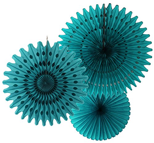 Studio : Devra Party Publisher : Devra Party Binding : Health and Beauty Product Description Beautiful set of three teal honeycomb tissue paper party fans - one 13 inch fan, one 18 inch fan, and one 21 inch fan. The decorative fans ship flat and come with an attached hanging string. Simply unfold the fan and use the string to hang along the wall, from a doorway, in a window, or from a ceiling. Create a fun photo or dessert table backdrop in minutes! Available in 24 different colors, these fans are perfect for birthdays, baby showers, weddings, graduation decor, retail displays, classroom decor, and other celebrations. Made in the USA by Devra Party. 0