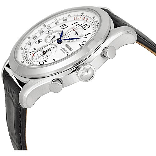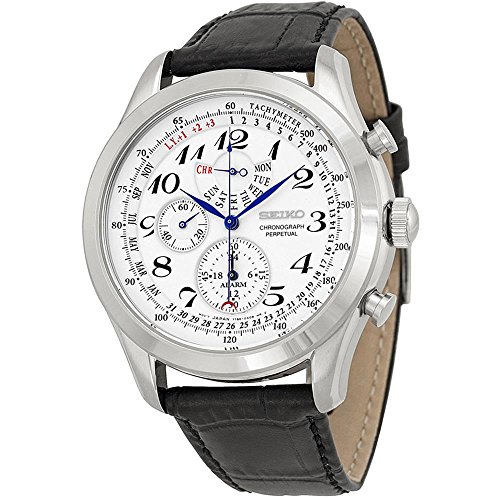 Stainless steel case with a black leather strap. Fixed stainless steel bezel. White dial with blue hands and Arabic numeral hour markers. Date and month scale around an inner ring. Tachymeter around the outer rim. Leap year indicator. Dial Type: Analog. Chronograph - two sub-dials displaying: 60 second, 60 minute / 24 hour (alarm). Day of the week display below the 12 o'clock position. Quartz movement. Scratch resistant Hardlex crystal. Solid case back. Case diameter: 45 mm. Case thickness: 12 mm. Round case shape. Band width: 22 mm. Tang clasp. Water resistant at 100 meters / 330 feet. Functions: chronograph, date, day, month, hour, minute, second. Casual watch style. Seiko Neo Classic Alarm Perpetual Chronograph White Dial Black Leather Mens Watch SPC131.Feature