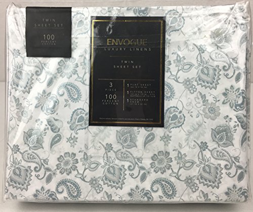 ENVOGUE Luxury Linens 100% Cotton Percale Sheet Set "Bloomfield" Dusty Blue Grey Floral Paisley on White (TWIN)